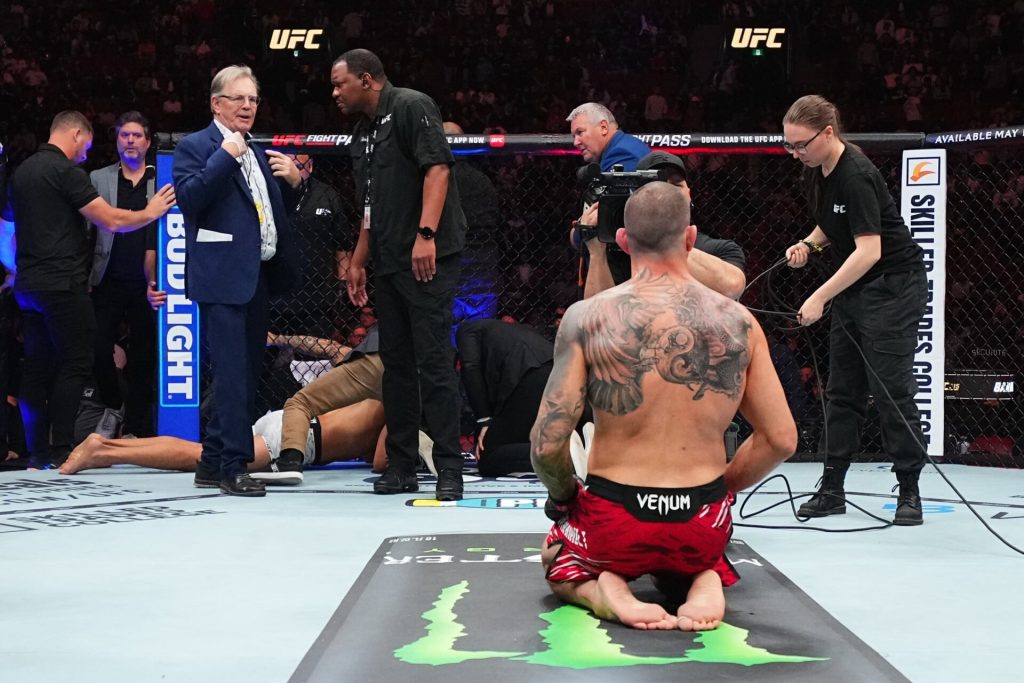 Hospitalized UFC 315 star provides health update amid ‘broken skull’ fears after scary KO loss