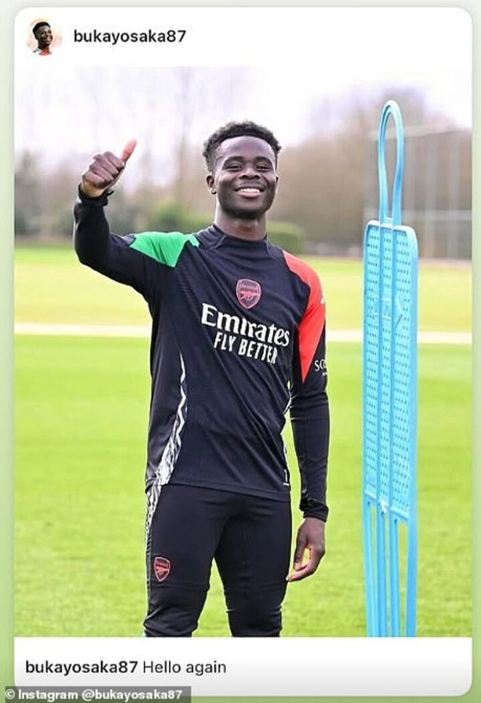It came last week and let Saka smile on the training fields of London Colney, accompanied by the caption 'Hello Again'.