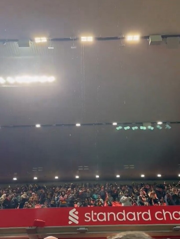 MANCHESTER UNITED fans let out a cheeky chant during their clash with Liverpool after one of Anfield's roofs started leaking. The Red Devils faithful have become accustomed to the roofs of Old Trafford's aging stands leaking when heavy rain showers occur.