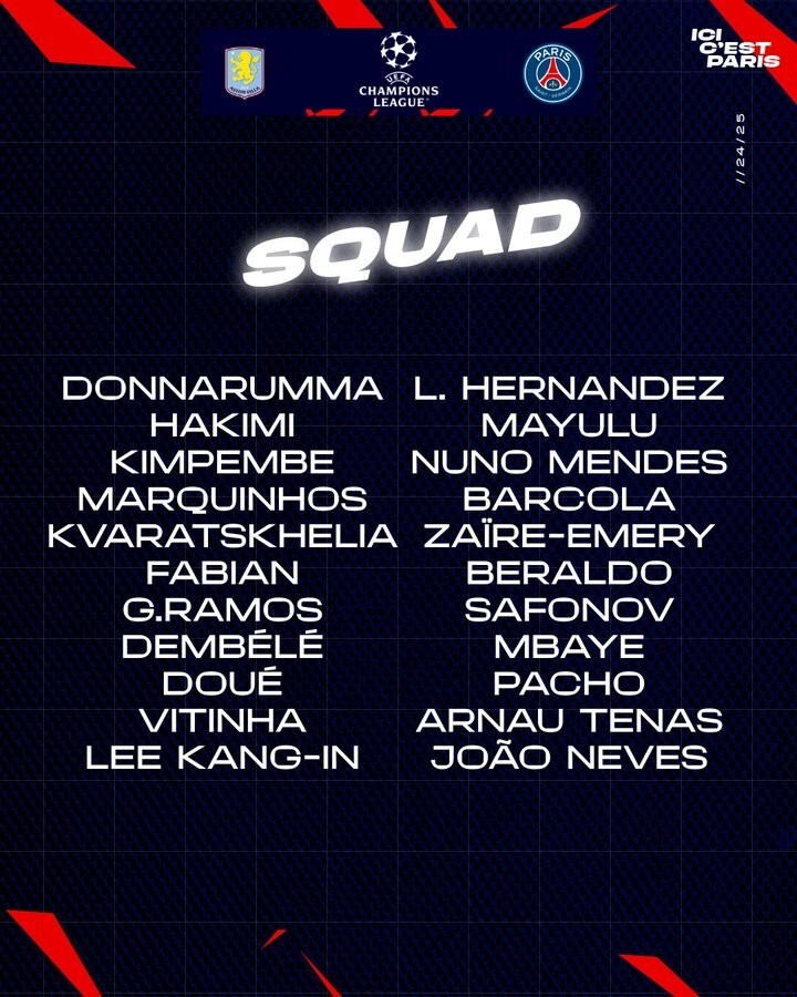 PSG has announced their team for the second stage of the Champions League -similar to Aston Villa. Viinha Leads, João Neves and Kvaratskhelia.