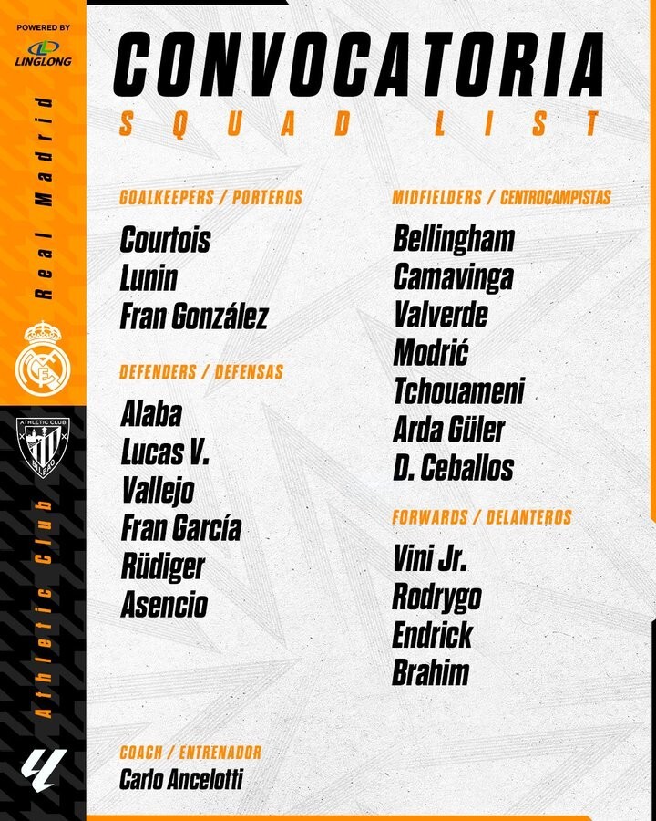 Real Madrid has officially announced their team for the La Liga Matchday 32 Home Game Against Athletic Club. Mbappé is absent, while Lunin returns to the team.